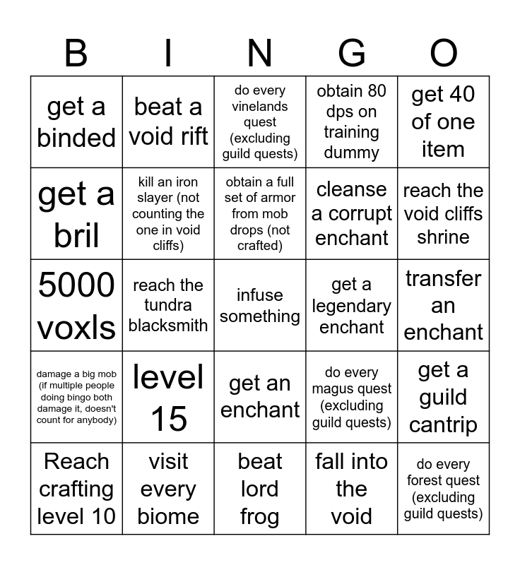 This bingo card has 25 words: level 15, beat lord frog, obtain a full set of armor from mob drops (not crafted), Reach crafting level 10, get 40 of one item, get a binded, get a bril, beat a void rift, get a legendary enchant, get an enchant, cleanse a corrupt enchant, 5000 voxls, do every magus quest (excluding guild quests), get a guild cantrip, kill an iron slayer (not counting the one in void cliffs), do every forest quest (excluding guild quests), transfer an enchant, do every vinelands quest (excluding guild quests), reach the void cliffs shrine, reach the tundra blacksmith, infuse something, visit every biome, damage a big mob (if multiple people doing bingo both damage it, doesn't count for anybody), obtain 80 dps on training dummy and fall into the void.