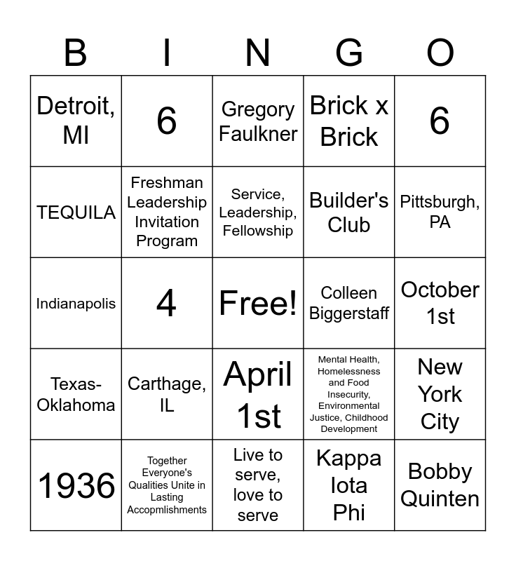 This bingo card has a free space and 24 words: Carthage, IL, Together Everyone's Qualities Unite in Lasting Accopmlishments, Service, Leadership, Fellowship, 1936, 6, Detroit, MI, TEQUILA, 6, Colleen Biggerstaff, April 1st, Builder's Club, Indianapolis, Mental Health, Homelessness and Food Insecurity, Environmental Justice, Childhood Development, New York City, Freshman Leadership Invitation Program, Kappa Iota Phi, October 1st, Gregory Faulkner, Pittsburgh, PA, 4, Bobby Quinten, Texas-Oklahoma, Brick x Brick and Live to serve, love to serve.