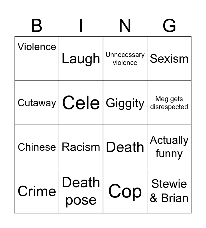 This bingo card has 16 words: Death pose, Actually funny, Unnecessary violence, Violence, Chinese, Laugh, Death, Cop, Cutaway, Cele, Crime, Sexism, Racism, Meg gets disrespected, Giggity and Stewie & Brian.