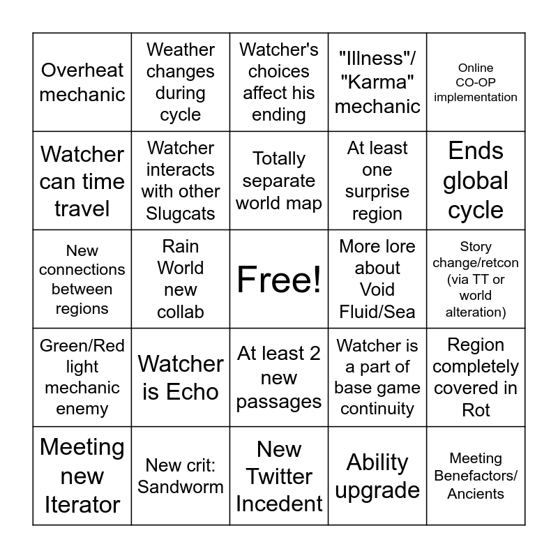 This bingo card has a free space and 24 words: Watcher is Echo, New crit: Sandworm, Totally separate world map, Meeting new Iterator, Online CO-OP implementation, Overheat mechanic, Watcher can time travel, Weather changes during cycle, More lore about Void Fluid/Sea, At least 2 new passages, At least one surprise region, New connections between regions, Watcher is a part of base game continuity, Region completely covered in Rot, Watcher interacts with other Slugcats, Ability upgrade, Story change/retcon (via TT or world alteration), Watcher's choices affect his ending, Ends global cycle, Rain World new collab, Meeting Benefactors/ Ancients, Green/Red light mechanic enemy, "Illness"/ "Karma" mechanic and New Twitter Incedent.
