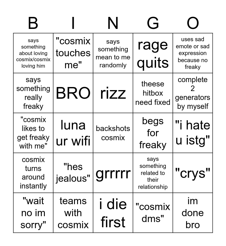 This bingo card has a free space and 24 words: "hes jealous", teams with cosmix, rizz, "wait no im sorry", uses sad emote or sad expression because no freaky, says something about loving cosmix/cosmix loving him, says something really freaky, "cosmix touches me", begs for freaky, grrrrr, theese hitbox need fixed, "cosmix likes to get freaky with me", says something related to their relationship, "crys", BRO, "cosmix dms", "i hate u istg", says something mean to me randomly, complete 2 generators by myself, luna ur wifi, im done bro, cosmix turns around instantly, rage quits and i die first.