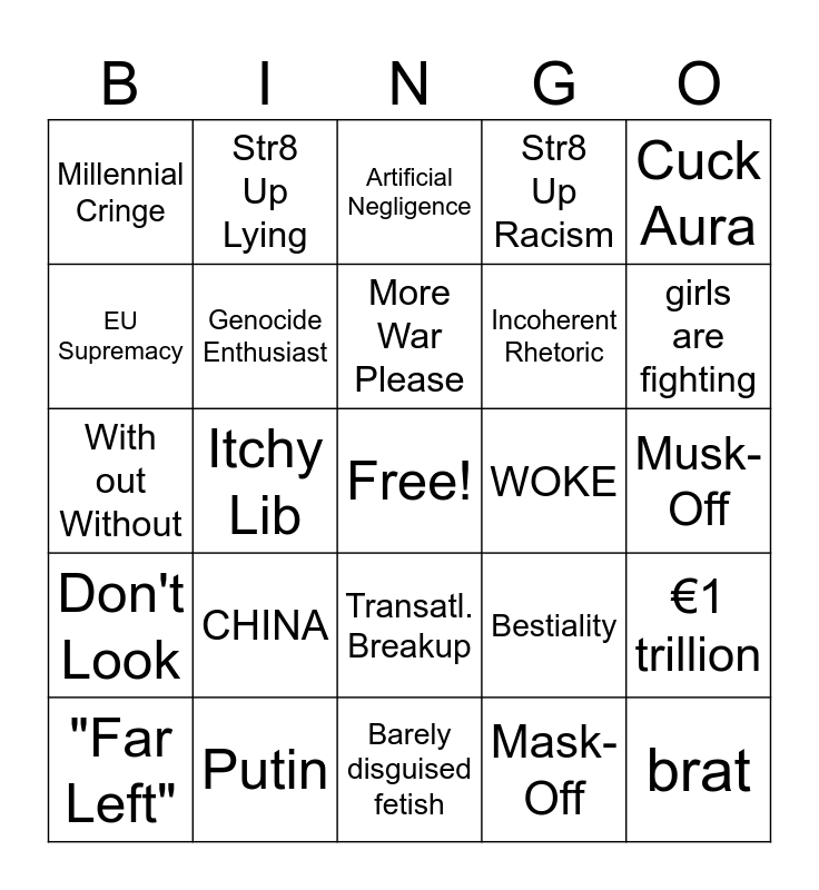 This bingo card has a free space and 24 words: CHINA, Putin, More War Please, "Far Left", Cuck Aura, Millennial Cringe, EU Supremacy, Str8 Up Lying, WOKE, Transatl. Breakup, Incoherent Rhetoric, With out Without, Bestiality, €1 trillion, Genocide Enthusiast, Mask-Off, Musk-Off, Artificial Negligence, girls are fighting, Itchy Lib, brat, Don't Look, Str8 Up Racism and Barely disguised fetish.
