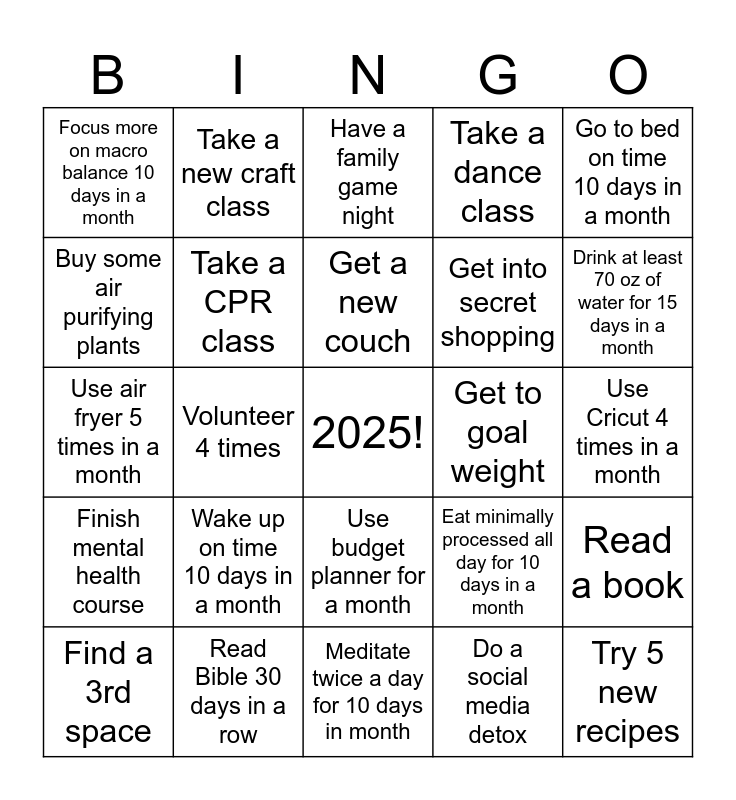 This bingo card has a free space and 24 words: Find a 3rd space, Wake up on time 10 days in a month, Get a new couch, Do a social media detox, Go to bed on time 10 days in a month, Focus more on macro balance 10 days in a month, Take a new craft class, Have a family game night, Get to goal weight, Use Cricut 4 times in a month, Use air fryer 5 times in a month, Take a CPR class, Eat minimally processed all day for 10 days in a month, Read a book, Buy some air purifying plants, Read Bible 30 days in a row, Meditate twice a day for 10 days in month, Take a dance class, Drink at least 70 oz of water for 15 days in a month, Finish mental health course, Volunteer 4 times, Use budget planner for a month, Get into secret shopping and Try 5 new recipes.