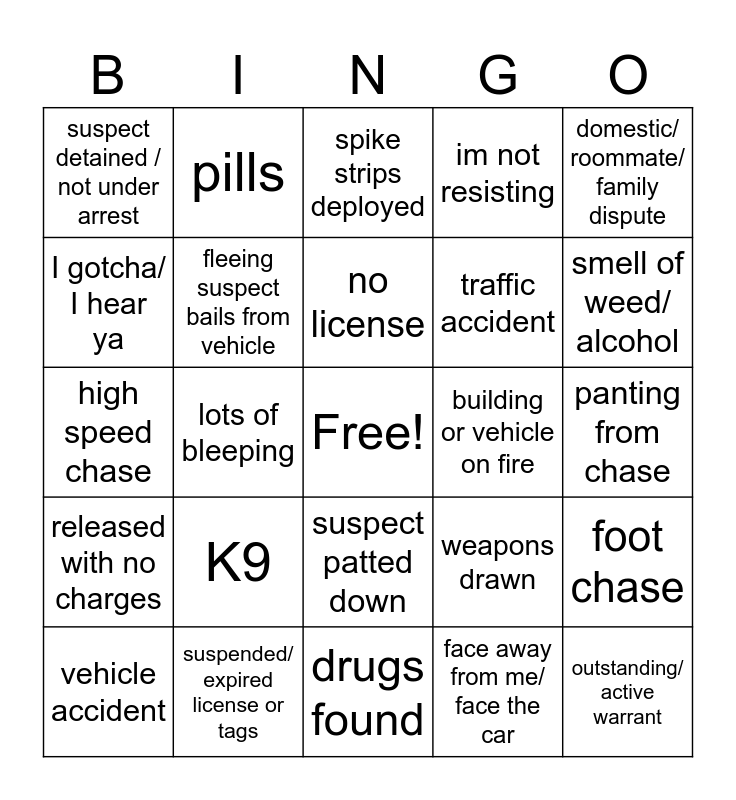 This bingo card has a free space and 24 words: K9, suspended/ expired license or tags, no license, vehicle accident, domestic/ roommate/ family dispute, suspect detained / not under arrest, I gotcha/ I hear ya, pills, building or vehicle on fire, suspect patted down, traffic accident, high speed chase, weapons drawn, foot chase, fleeing suspect bails from vehicle, face away from me/ face the car, panting from chase, spike strips deployed, smell of weed/ alcohol, lots of bleeping, outstanding/ active warrant, released with no charges, im not resisting and drugs found.