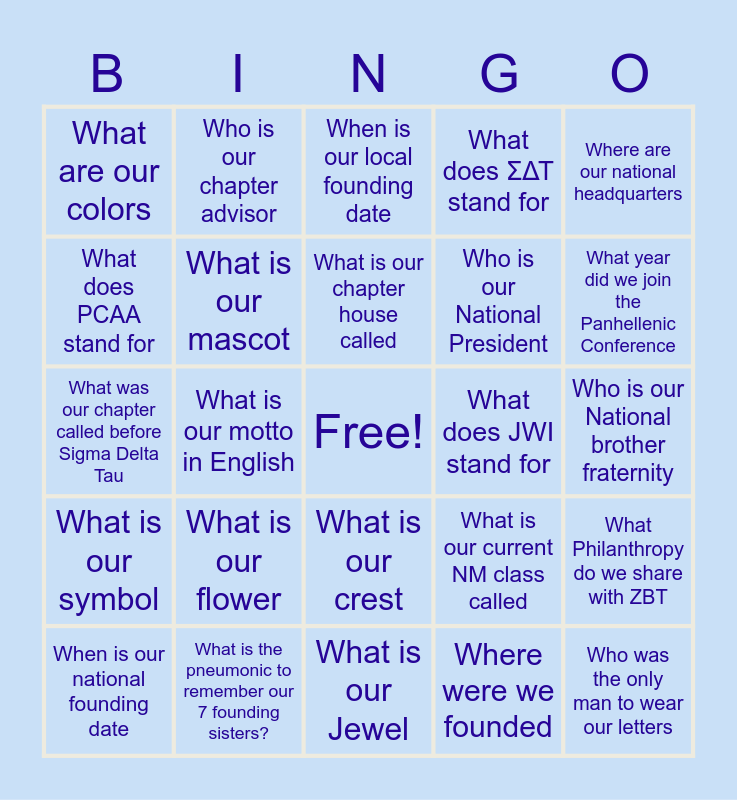 This bingo card has a free space and 29 words: When is our national founding date, What is our chapter, What is our motto in English, What are our values, What are our colors, When is our local founding date, What is our mascot, What is our flower, What does JWI stand for, What is the pneumonic to remember our 7 founding sisters?, Who is our National brother fraternity, Who was the only man to wear our letters, What is our Jewel, Where were we founded, What year did we join the Panhellenic Conference, What is our motto in Latin, What is our crest, What is our symbol, Where are our national headquarters, What was our chapter called before Sigma Delta Tau, What is our current NM class called, What is our local philanthropy, Who is our National President, What does PCAA stand for, What does ΣΔΤ stand for, Who is our chapter advisor, What Philanthropy do we share with ΖΒΤ, What is our chapter house called and What is our philanthropy for SDT sisters.