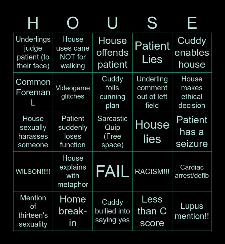 This bingo card has a free space and 36 words: Xander sucks at video game, Wren forgets it's her line, Hilarious Art, Videogame glitches, RACISM!!!, WILSON!!!!!, Cuddy foils cunning plan, Blood in urine or Faeces, Cuddy enables house, House steals, Patient suddenly loses function, Patient Lies, House humiliates underling, House lies, House makes ethical decision, Underlings judge patient (to their face), House body shames, House explains with metaphor, Lupus mention!!, House offends patient, Patient has a seizure, Cardiac arrest/defib, Home break-in, Mention of thirteen's sexuality, Cuddy bullied into saying yes, House uses cane NOT for walking, House sexually harasses someone, Weird hill to die on, Underling comment out of left field, Common Foreman L, A SCORE OR ABOVE, Common B score, Less than C score, FAIL, Patient dies and Dialogue option is misleading.