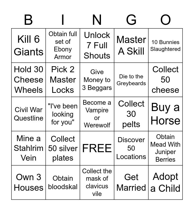 This bingo card has 43 words: Main Questline, Become a Vampire or Werewolf, Obtain dawnbreaker, Own 3 Houses, Obtain 5 Followers, Get Married, Unlock 7 Full Shouts, Obtain 8 Dragon Priest Masks, 10 Bunnies Slaughtered, Obtain bloodskal, Master A Skill, Collect 30 pelts, FREE, Collect 50 silver plates, Obtain the black star, Collect the mask of clavicus vile, Companions Questline, Civil War Questline, Collect 30 carrots, Collect 50 cheese, Obtain full set of Ebony Armor, Hold 8000 Gold Pieces, Obtain spell knight armor, Kill 6 Giants, Learn a Master Level Spell, Buy a Horse, Hold 10 Buckets, Become a Bard, Discover 50 Locations, Mine a Stahlrim Vein, Obtain Notched Pickaxe, Obtain Mead With Juniper Berries, Bandit Says "Skyrim Belongs to the Nords", "I've been looking for you", Hold 3 Claws, Complete 10 Miscellaneous Quests, Adopt a Child, Give Money to 3 Beggars, Hold 30 Cheese Wheels, Die to the Greybeards, Teabag Cultists, Pick 2 Master Locks and Restore Gildergreen.