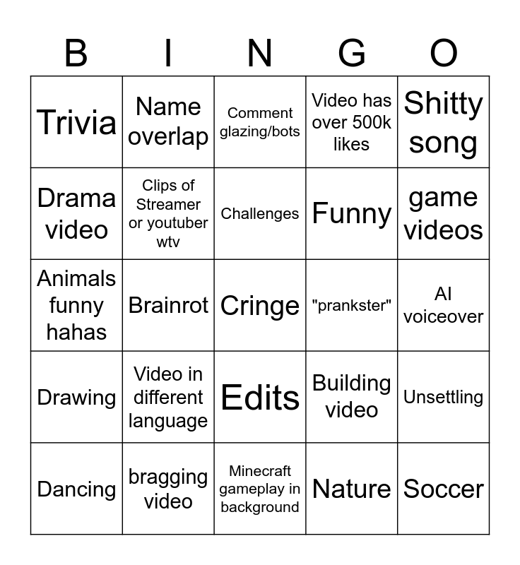 This bingo card has a free space and 29 words: Dancing, Whore, Brainrot, Food/Mukbang, Trivia, Comment glazing/bots, Clips of Streamer or youtuber wtv, Video in different language, "prankster", bragging video, AI voiceover, Soccer, Minecraft gameplay in background, Nature, game videos, AI video, Edits, Drawing, Shitty song, Animals funny hahas, Building video, Specifically indians, Funny, Drama video, Video has over 500k likes, Name overlap, Unsettling, Challenges and Satisfying.