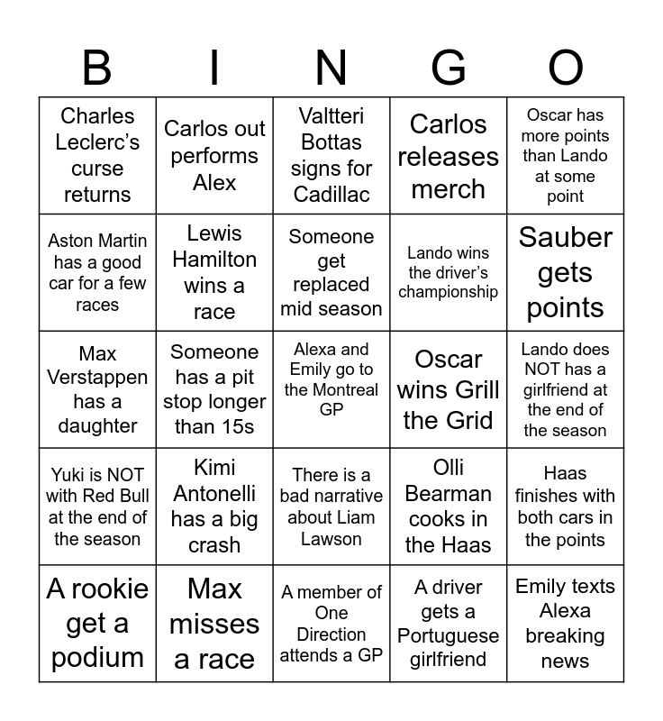 This bingo card has a free space and 24 words: Kimi Antonelli has a big crash, Max misses a race, Someone get replaced mid season, A rookie get a podium, Oscar has more points than Lando at some point, Charles Leclerc’s curse returns, Aston Martin has a good car for a few races, Carlos out performs Alex, Oscar wins Grill the Grid, There is a bad narrative about Liam Lawson, Lando wins the driver’s championship, Max Verstappen has a daughter, Olli Bearman cooks in the Haas, Haas finishes with both cars in the points, Lewis Hamilton wins a race, A driver gets a Portuguese girlfriend, Lando does NOT has a girlfriend at the end of the season, Valtteri Bottas signs for Cadillac, Sauber gets points, Someone has a pit stop longer than 15s, Emily texts Alexa breaking news, Yuki is NOT with Red Bull at the end of the season, Carlos releases merch and A member of One Direction attends a GP.