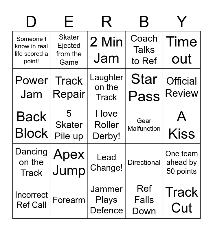 This bingo card has a free space and 24 words: Apex Jump, Forearm, Laughter on the Track, Incorrect Ref Call, Time out, Someone I know in real life scored a point!, Power Jam, Skater Ejected from the Game, Gear Malfunction, Lead Change!, Star Pass, Back Block, Directional, One team ahead by 50 points, Track Repair, Ref Falls Down, A Kiss, 2 Min Jam, Official Review, 5 Skater Pile up, Track Cut, Dancing on the Track, Coach Talks to Ref and Jammer Plays Defence.