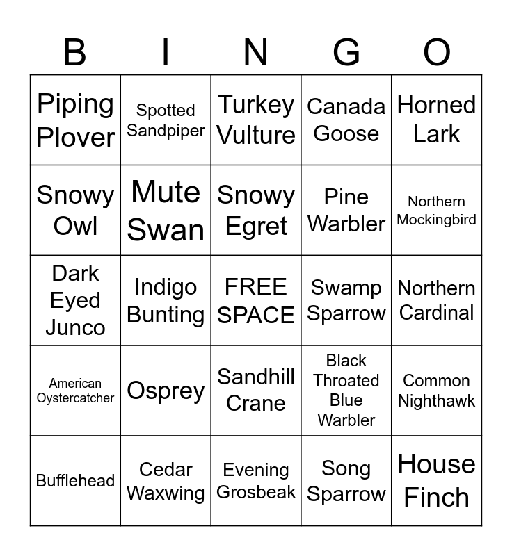 This bingo card has a free space and 75 words: Red Winged Blackbird, Roseate Spoonbill, Turkey Vulture, Great Blue Heron, Eastern Meadowlark, Warbling Vireo, Common Merganser, Eastern Whippoorwill, Eastern Phoebe, Blue Jay, European Starling, Red Bellied Woodpecker, Snowy Egret, Snowy Owl, Ring Necked Pheasant, Indigo Bunting, Peregrine Falcon, House Finch, Canada Jay, Horned Lark, Common Grackle, Dark Eyed Junco, Mute Swan, Spotted Sandpiper, Canada Goose, Bald Eagle, Calliope Hummingbird, American Goldfinch, Gray Catbird, Carolina Wren, Rock Pigeon, Chimney Swift, American Herring Gull, Black Throated Blue Warbler, Northern Mockingbird, Pine Warbler, Wood Duck, Harlequin Duck, Northern Cardinal, Song Sparrow, Red Tailed Hawk, White Breasted Nuthatch, Snow Bunting, Merlin, Great Horned Owl, Ring Billed Gull, Bufflehead, Piping Plover, Black Capped Chickadee, Killdeer, American Robin, Sandhill Crane, Brown Headed Cowbird, Mourning Dove, Brown Pelican, Cooper's Hawk, Baltimore Oriole, Scarlet Tanager, Ovenbird, Belted Kingfisher, Osprey, Mallard, Ruby Throated Hummingbird, Golden Crowned Kinglet, White Ibis, Swamp Sparrow, Pine Grosbeak, Downy Woodpecker, Purple Martin, Common Nighthawk, American Oystercatcher, Cedar Waxwing, Eastern Bluebird, Evening Grosbeak and Green Winged Teal.