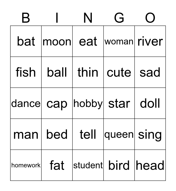 This bingo card has a free space and 24 words: bed, fat, thin, homework, river, bat, fish, moon, star, tell, cute, dance, queen, sing, ball, bird, doll, eat, sad, cap, head, man, woman and student.