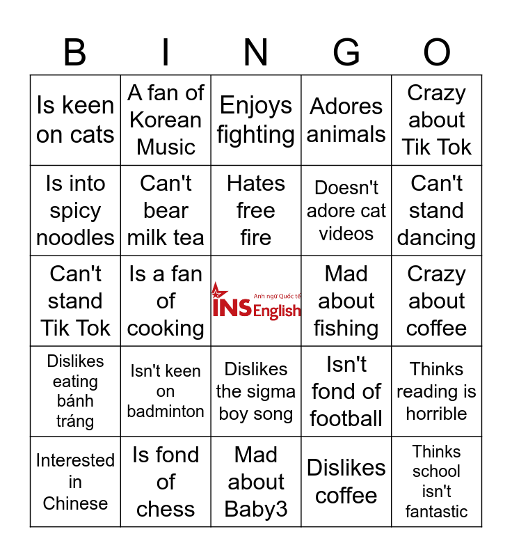 This bingo card has a free space and 24 words: Isn't keen on badminton, Is fond of chess, Hates free fire, Interested in Chinese, Crazy about Tik Tok, Is keen on cats, Is into spicy noodles, A fan of Korean Music, Mad about fishing, Dislikes the sigma boy song, Doesn't adore cat videos, Can't stand Tik Tok, Isn't fond of football, Thinks reading is horrible, Can't bear milk tea, Dislikes coffee, Crazy about coffee, Enjoys fighting, Can't stand dancing, Is a fan of cooking, Thinks school isn't fantastic, Dislikes eating bánh tráng, Adores animals and Mad about Baby3.