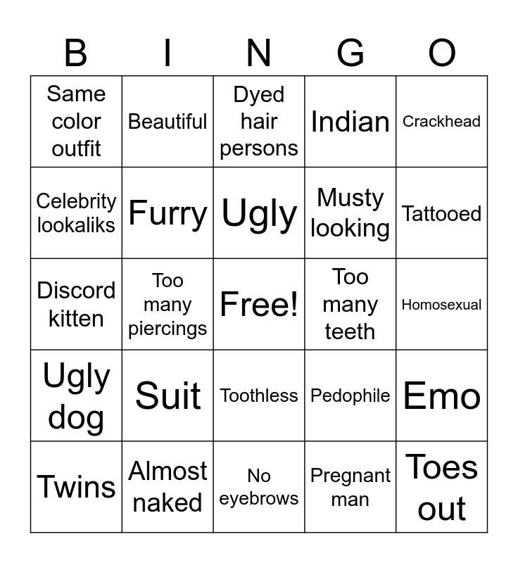 This bingo card has a free space and 24 words: Suit, Almost naked, Ugly, Twins, Crackhead, Same color outfit, Celebrity lookaliks, Beautiful, Too many teeth, Toothless, Musty looking, Discord kitten, Pedophile, Emo, Furry, Pregnant man, Homosexual, Dyed hair persons, Tattooed, Too many piercings, Toes out, Ugly dog, Indian and No eyebrows.