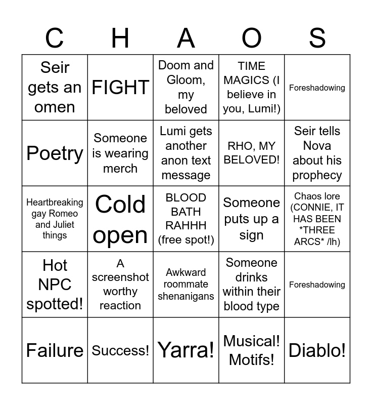This bingo card has a free space and 54 words: Lumi talks about books, Hot NPC spotted!, Cat spotted! (seen/heard), Butch, my beloved, Awkward roommate shenanigans, Awkward neighbour shenanigans, TIME MAGICS (I believe in you, Lumi!), Xainan being a bottom /lh, Poetry, The River mention, Seir gets an omen, Spider things, Success!, Failure, Mixed success, Yarra!, Diablo!, RHO, MY BELOVED!, Tense emotional looks from across the room, Chaos lore (CONNIE, IT HAS BEEN *THREE ARCS* /lh), Someone drinks within their blood type, Someone drinks outside of their blood type, Someone puts up a sign, Foreshadowing, Beau and Mav, I am holding them in my hands like a baby bird, FIGHT, A gay duel, Xainan being a tired father, We find out who Mortal!Lumi is, Musical! Motifs!, “Trust in Her Will”, Sing haunts the narrative, Ren haunts the narrative, Seir goes to work (is the job in the room with us?!), Doom and Gloom, my beloved, Sea screams/ barks in chat /lh, Heartbreaking gay Romeo and Juliet things, Foreshadowing, Doom/ Fate lore!, Someone is wearing merch, INT - BOOKSTORE - NIGHT, INT - RESTAURANT - NIGHT, At the ICMA, The Connie Cliffhanger (TM), A screenshot worthy reaction, Lumi is a “healer”, SAMM fans faerself, Something homosexual is happening on my screen, Lumi gets another anon text message, Cold open, Seir tells Nova about his prophecy, TIVASH!, ANUGATA BARK BAKR and Ying He being sneaky on accident (shadow magic).