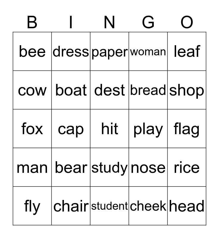 This bingo card has a free space and 24 words: bear, chair, dest, fly, leaf, bee, cow, dress, play, study, bread, fox, nose, rice, boat, cheek, flag, paper, shop, cap, head, man, woman and student.