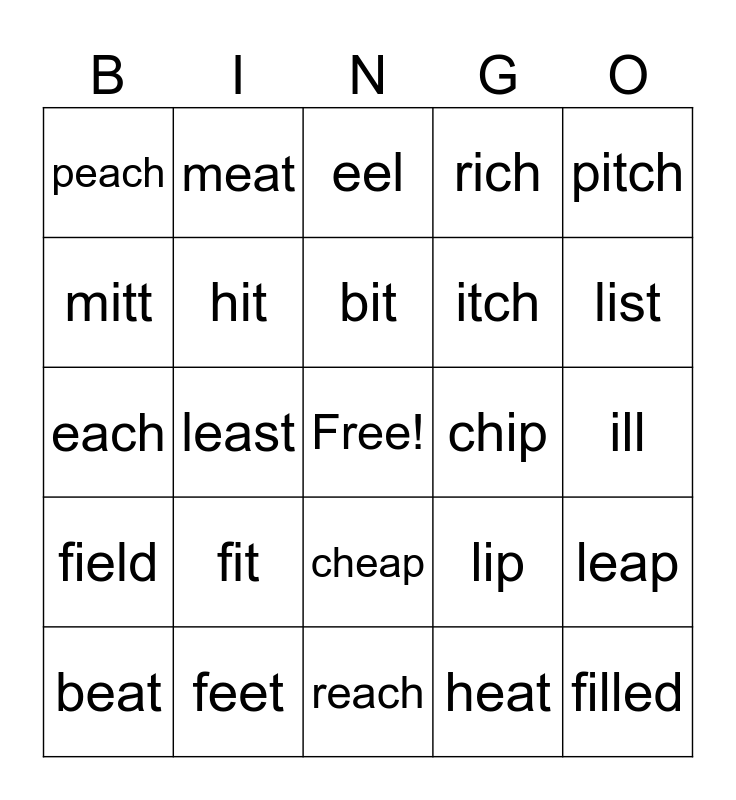 This bingo card has a free space and 24 words: fit, feet, bit, beat, pitch, peach, mitt, meat, chip, cheap, itch, each, lip, leap, hit, heat, ill, eel, list, least, filled, field, rich and reach.