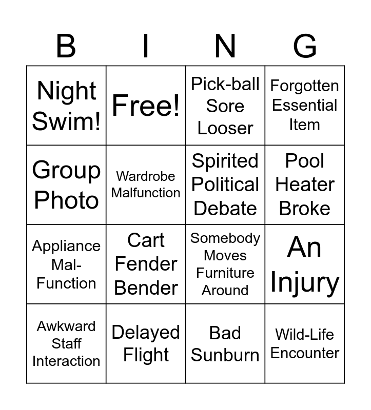 This bingo card has 16 words: Delayed Flight, An Injury, Pick-ball Sore Looser, Night Swim!, Appliance Mal-Function, Free!, Somebody Moves Furniture Around, Bad Sunburn, Group Photo, Wardrobe Malfunction, Awkward Staff Interaction, Forgotten Essential Item, Cart Fender Bender, Pool Heater Broke, Spirited Political Debate and Wild-Life Encounter.