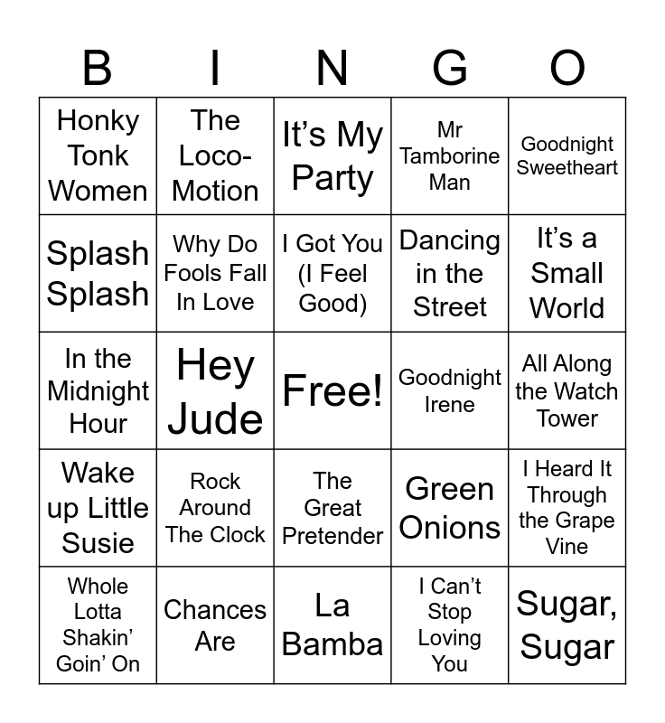 This bingo card has a free space and 100 words: (I Can’t Get No) Satisfaction, A Day In the Life, All Along the Watch Tower, All I Have to Do Is Dream, All Shook Up, At Last, At the Hop, Barbara Ann, Be My Baby, Big Bad John, Big Girls Don’t Cry, Born to Be Wild, California Dreamin’, Chances Are, Chantilly Lace, Come Go with Me, Dancing in the Street, Diana, Dream Lover, Earth Angel, Everyday People, For What It’s Worth, Georgia On My Mind, Good Golly, Miss Molly, Good Vibrations, Goodnight Irene, Goodnight Sweetheart, Green Onions, Happy Together, Hello Dolly, Hey Jude, Honky Tonk Women, Hound Dog, How High the Moon, I Can’t Stop Loving You, I Got You (I Feel Good), I Heard It Through the Grape Vine, I Left My Heart In San Francisco, I Only Have Eyes For You, I Walk the Line, I Want You Back, I’m a Believer, In the Midnight Hour, In the Still of the Night, It’s a Small World, It’s My Party, Jailhouse Rock, Jumpin’ Jack Flash, Kokomo, La Bamba, Light My Fire, Like a Rolling Stone, Little Darlin’, Long Tall Sally, Love Is A Many Splendored Thing, Love Letters In the Sand, Money Honey, Money, Mister Sandman, Mr Tamborine Man, Mrs Robinson, My Girl, My Way, Oh, Pretty Woman, Paint It Black, Papa’s Got a Brand New Bag, Proud Mary, Purple Haze, Raindrops Keep Fallin’ On My Head, Respect, River Deep Mountain High, Rock Around The Clock, Save the last Dance for Me, Searchin’, Sh-Boom, Sittin’ On the Dock of the Bay, Smoke Gets In Your Eyes, Splash Splash, Stand By Me, Stop! In the Name of Love, Sugar Shack, Sugar, Sugar, Tequila, The Great Pretender, The Letter, The Loco-Motion, The Sounds of Silence, The Twist, Tossin’ and Turnin’, Wake up Little Susie, Walkin’ After Midnight, What’d I Say, White Rabbit, Whole Lotta Shakin’ Goin’ On, Why Do Fools Fall In Love, Will You Love Me Tomorrow, Yakety Yak, You Really Got Me, You’ve Lost That Lovin’ Feelin’ and Do Wah Diddy Diddy.