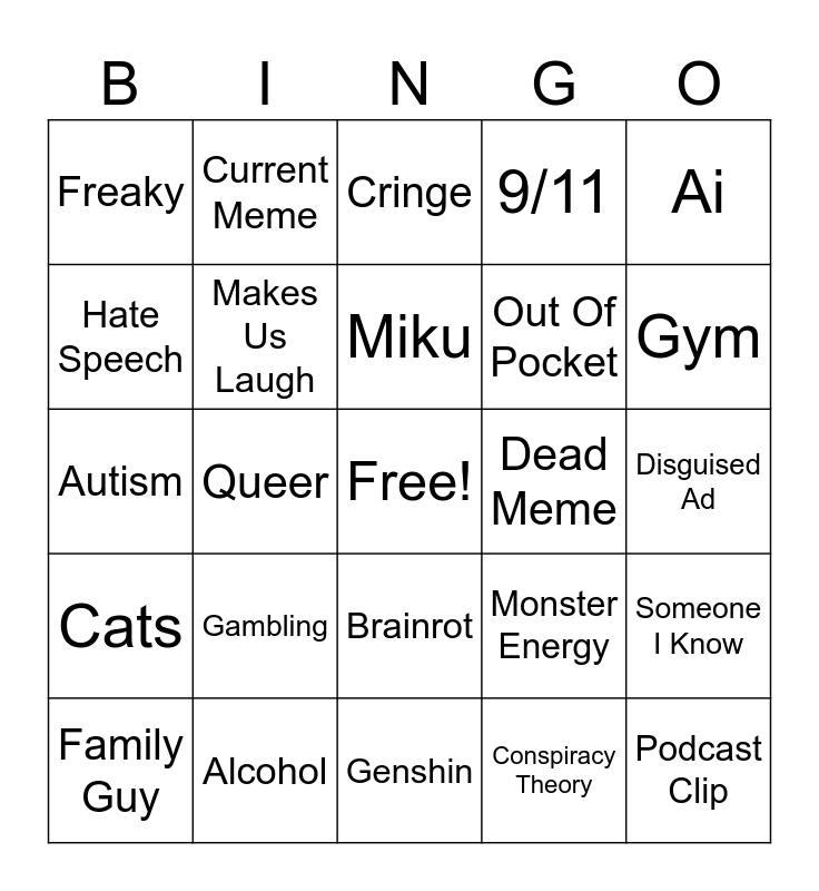 This bingo card has a free space and 24 words: Gambling, Alcohol, Miku, Family Guy, Ai, Freaky, Hate Speech, Current Meme, Dead Meme, Brainrot, Out Of Pocket, Autism, Monster Energy, Someone I Know, Makes Us Laugh, Conspiracy Theory, Disguised Ad, Cringe, Gym, Queer, Podcast Clip, Cats, 9/11 and Genshin.