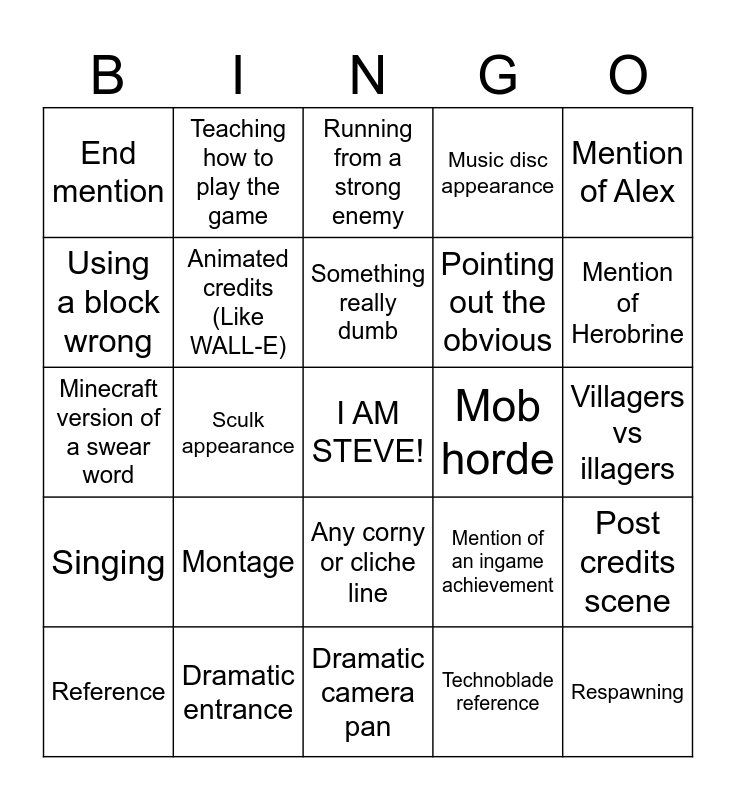 This bingo card has a free space and 24 words: Montage, Dramatic entrance, Something really dumb, Reference, Mention of Alex, End mention, Using a block wrong, Teaching how to play the game, Mob horde, Any corny or cliche line, Pointing out the obvious, Minecraft version of a swear word, Mention of an ingame achievement, Post credits scene, Animated credits (Like WALL-E), Technoblade reference, Villagers vs illagers, Running from a strong enemy, Mention of Herobrine, Sculk appearance, Respawning, Singing, Music disc appearance and Dramatic camera pan.