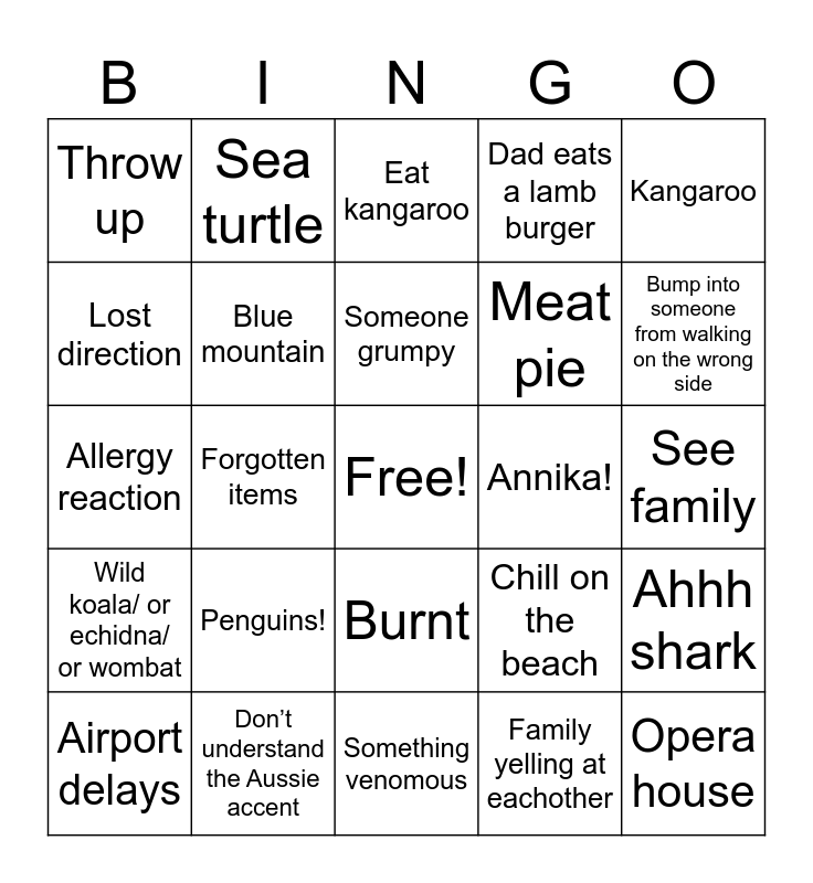 This bingo card has a free space and 24 words: Airport delays, Penguins!, Someone grumpy, Family yelling at eachother, Kangaroo, Throw up, Sea turtle, Eat kangaroo, Annika!, See family, Allergy reaction, Blue mountain, Chill on the beach, Ahhh shark, Lost direction, Don’t understand the Aussie accent, Something venomous, Dad eats a lamb burger, Bump into someone from walking on the wrong side, Wild koala/ or echidna/ or wombat, Forgotten items, Burnt, Meat pie and Opera house.