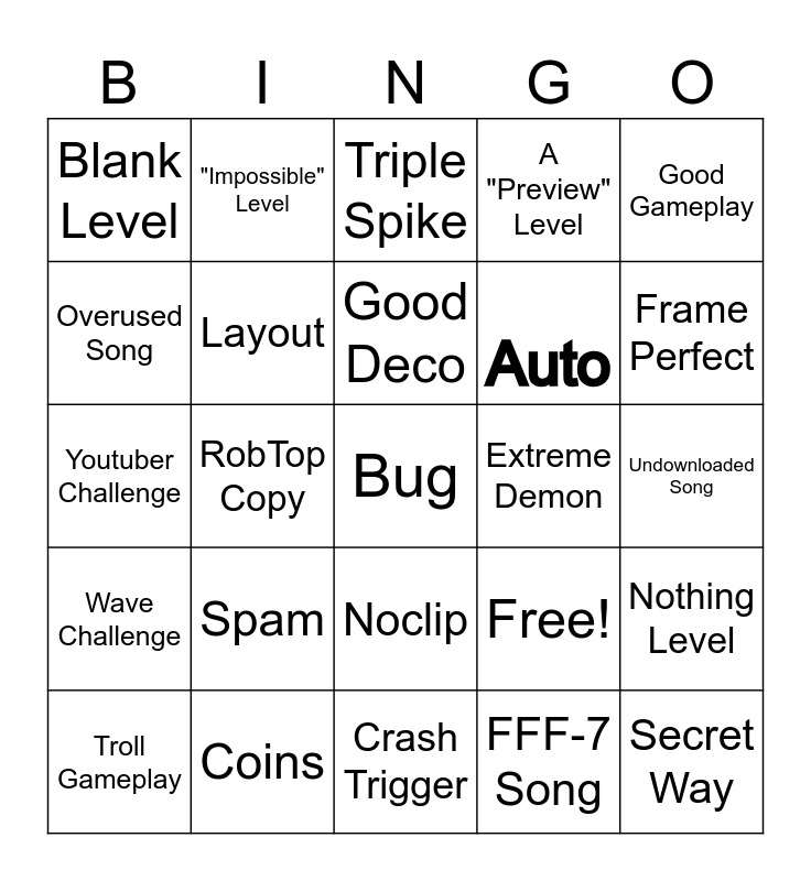 This bingo card has 25 words: Spam, Crash Trigger, Good Deco, Troll Gameplay, Good Gameplay, Blank Level, Overused Song, "Impossible" Level, Extreme Demon, Noclip, Auto, Youtuber Challenge, Free!, Nothing Level, Layout, Secret Way, Undownloaded Song, Triple Spike, Frame Perfect, RobTop Copy, Bug, Coins, Wave Challenge, A "Preview" Level and FFF-7 Song.
