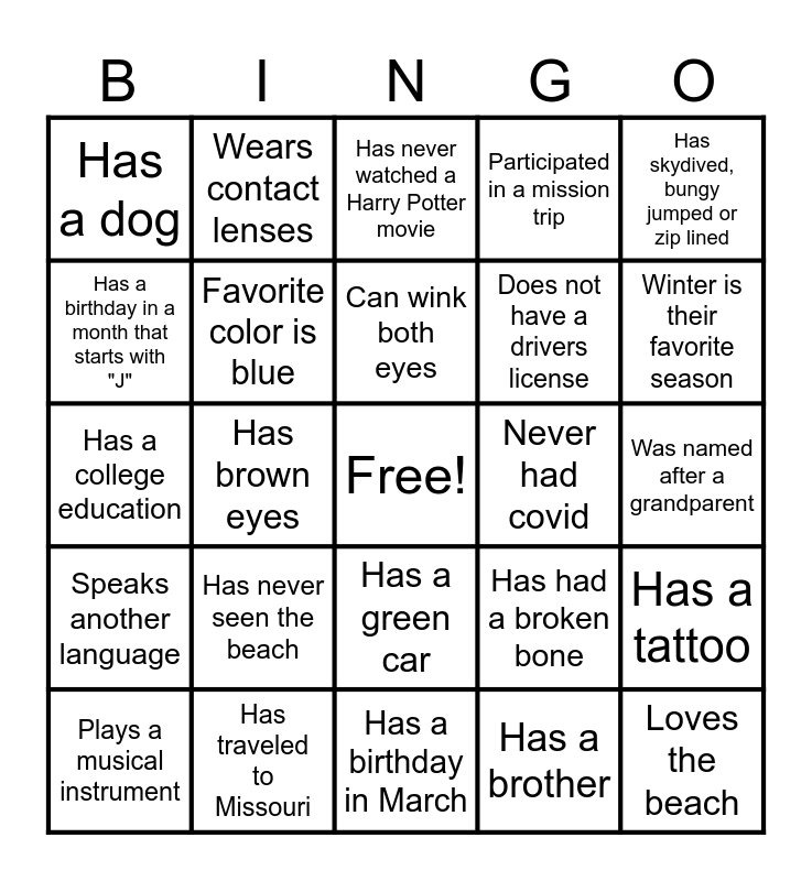 This bingo card has a free space and 29 words: Is an only child, Has traveled to Missouri, Has never watched a Harry Potter movie, Is left-handed, Has skydived, bungy jumped or zip lined, Has a dog, Favorite color is blue, Can wink both eyes, Never had covid, Has a tattoo, Plays a musical instrument, Has brown eyes, Has a brother, Loves the beach, Has a college education, Has lived in another state (besides VA), Has a birthday in March, Has had a broken bone, Winter is their favorite season, Speaks another language, Has never seen the beach, Has been in a helicopter, Does not have a drivers license, Was named after a grandparent, Has a birthday in a month that starts with "J", Wears contact lenses, Has a green car, Participated in a mission trip and Has an I Phone.