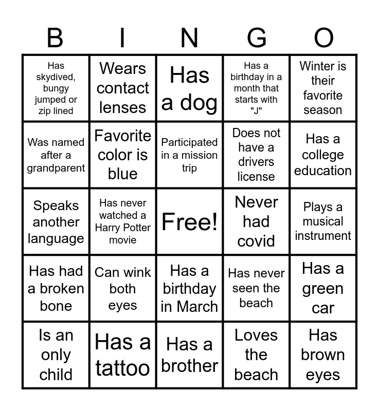 This bingo card has a free space and 29 words: Is an only child, Has traveled to Missouri, Has never watched a Harry Potter movie, Is left-handed, Has skydived, bungy jumped or zip lined, Has a dog, Favorite color is blue, Can wink both eyes, Never had covid, Has a tattoo, Plays a musical instrument, Has brown eyes, Has a brother, Loves the beach, Has a college education, Has lived in another state (besides VA), Has a birthday in March, Has had a broken bone, Winter is their favorite season, Speaks another language, Has never seen the beach, Has been in a helicopter, Does not have a drivers license, Was named after a grandparent, Has a birthday in a month that starts with "J", Wears contact lenses, Has a green car, Participated in a mission trip and Has an I Phone.