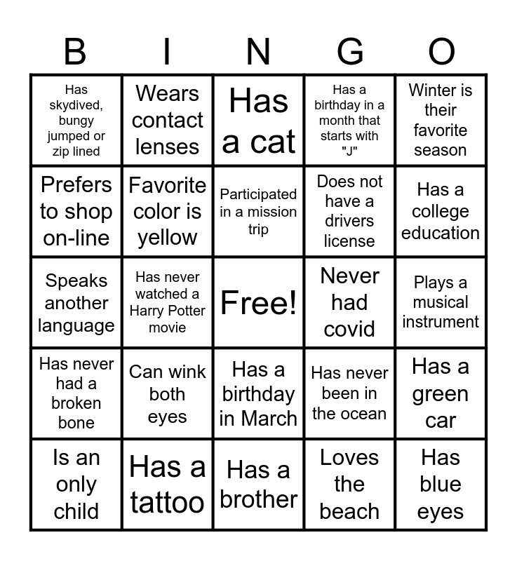 This bingo card has a free space and 29 words: Is an only child, Has traveled to Missouri, Has never watched a Harry Potter movie, Is left-handed, Has skydived, bungy jumped or zip lined, Has a cat, Favorite color is yellow, Can wink both eyes, Never had covid, Has a tattoo, Plays a musical instrument, Has blue eyes, Has a brother, Loves the beach, Has a college education, Has lived in another state (besides VA), Has a birthday in March, Has never had a broken bone, Winter is their favorite season, Speaks another language, Has never been in the ocean, Has been in a helicopter, Does not have a drivers license, Prefers to shop on-line, Has a birthday in a month that starts with "J", Wears contact lenses, Has a green car, Participated in a mission trip and Has an I Phone.