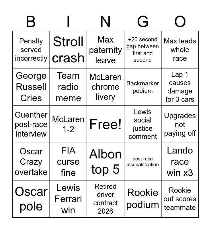 This bingo card has a free space and 24 words: FIA curse fine, Lewis Ferrari win, McLaren chrome livery, Oscar pole, Max leads whole race, Penalty served incorrectly, George Russell Cries, Stroll crash, Lewis social justice comment, Albon top 5, Backmarker podium, Guenther post-race interview, post race disqualification, Lando race win x3, Team radio meme, Rookie podium, Upgrades not paying off, Max paternity leave, Lap 1 causes damage for 3 cars, McLaren 1-2, Rookie out scores teammate, Oscar Crazy overtake, +20 second gap between first and second and Retired driver contract 2026.