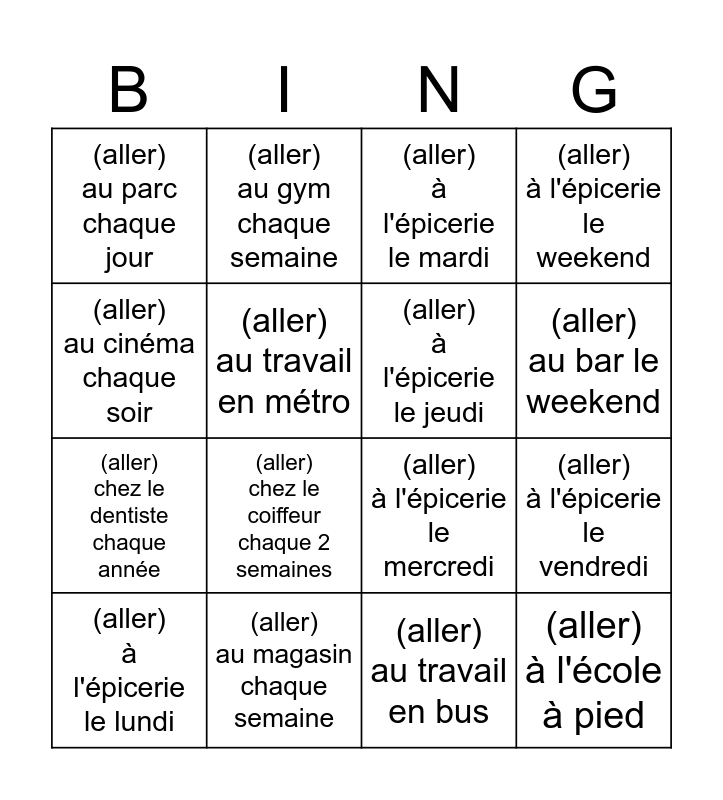 This bingo card has 23 words: (aller) à l'école à pied, (aller) au restaurant chaque mois, (aller) au bar le weekend, (aller) au travail à pied, (aller) au cinéma chaque soir, (aller) au parc chaque jour, (aller) au travail en métro, (aller) au gym chaque semaine, (aller) à l'épicerie le lundi, (aller) chez des amis chaque semaine, (aller) chez le coiffeur chaque 2 semaines, (aller) chez le dentiste chaque année, (aller) au gym le soir, ☺, (aller) au magasin chaque semaine, (aller) à l'école en bus, (aller) à l'épicerie le mardi, (aller) à l'épicerie le mercredi, (aller) à l'épicerie le jeudi, (aller) à l'épicerie le vendredi, (aller) à l'épicerie le weekend, (aller) au travail en bus and (aller) au restaurant chaque semaine.