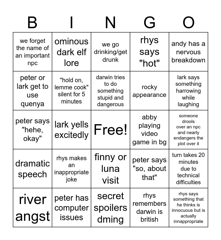 This bingo card has a free space and 24 words: rhys makes an inappropriate joke, peter has computer issues, darwin tries to do something stupid and dangerous, river angst, andy has a nervous breakdown, we forget the name of an important npc, peter or lark get to use quenya, ominous dark elf lore, abby playing video game in bg, finny or luna visit, rocky appearance, peter says "hehe, okay", peter says "so, about that", turn takes 20 minutes due to technical difficulties, "hold on, lemme cook" silent for 5 minutes, rhys remembers darwin is british, someone drools over an npc and nearly endangers the plot over it, we go drinking/get drunk, lark says something harrowing while laughing, lark yells excitedly, rhys says something that he thinks is innocuous but is actually innappropriate, dramatic speech, rhys says "hot" and secret spoilers dming.