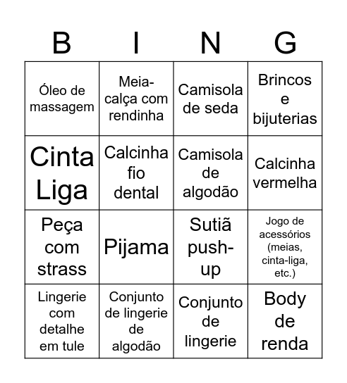 This bingo card has 26 words: Free!, Sutiã de renda, Calcinha vermelha, Calcinha branca, Cinta Liga, Óleo de massagem, Calcinha fio dental, Meia-calça com rendinha, Conjunto de lingerie, Lingerie com estampa de oncinha, Peça com strass, Sutiã push-up, Conjunto de lingerie branca, Lingerie preta, Jogo de acessórios (meias, cinta-liga, etc.), Lingerie sexy, Brincos e bijuterias, Body de renda, Camisola de seda, Lingerie com detalhe em tule, Pijama, Sutiã com bojo, Conjunto de lingerie de algodão, Sutiã sem bojo, Camisola de algodão and Cremes.