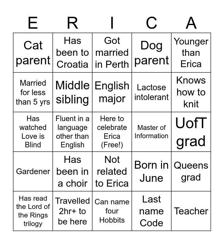 This bingo card has a free space and 30 words: Travelled 2hr+ to be here, Married for over 30 years, Fluent in a language other than English, Knew Erica as a baby, Cat parent, Got married in Perth, Middle sibling, Not related to Erica, Master of Information, Can name four Hobbits, UofT grad, Teacher, Last name Code, Lives in Kingston, Knows how to knit, Can name 10 musicals, Born in June, Gardener, Has been in a choir, Younger than Erica, Has watched Love is Blind, Plays a sport, Has been to Croatia, Lactose intolerant, Married for less than 5 yrs, Dog parent, Queens grad, Has read the Lord of the Rings trilogy, English major and Plays the piano.