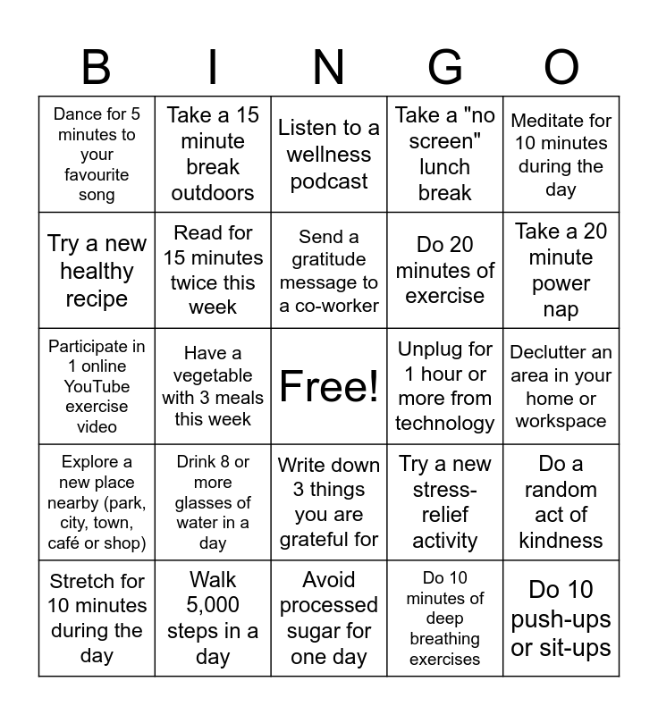 This bingo card has a free space and 24 words: Drink 8 or more glasses of water in a day, Walk 5,000 steps in a day, Send a gratitude message to a co-worker, Stretch for 10 minutes during the day, Meditate for 10 minutes during the day, Dance for 5 minutes to your favourite song, Try a new healthy recipe, Take a 15 minute break outdoors, Unplug for 1 hour or more from technology, Write down 3 things you are grateful for, Do 20 minutes of exercise, Participate in 1 online YouTube exercise video, Try a new stress-relief activity, Do a random act of kindness, Read for 15 minutes twice this week, Do 10 minutes of deep breathing exercises, Declutter an area in your home or workspace, Listen to a wellness podcast, Take a 20 minute power nap, Have a vegetable with 3 meals this week, Do 10 push-ups or sit-ups, Explore a new place nearby (park, city, town, café or shop), Take a "no screen" lunch break and Avoid processed sugar for one day.