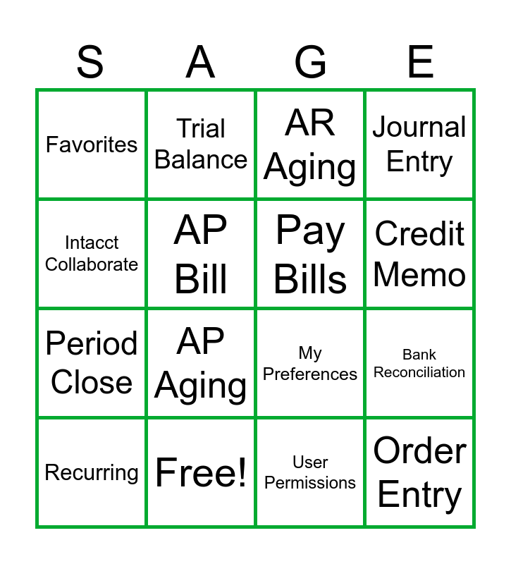 This bingo card has 28 words: Audit Trail, Dimension, Period Close, Chart of Accounts, AP Bill, AR Aging, Trial Balance, Order Entry, Free!, Dashboard, My Preferences, Journal Entry, Custom View, New Vendor, AP Aging, New Customer, Account Group, Pay Bills, Credit Memo, Allocations, Favorites, Memorize, Recurring, Bank Reconciliation, User Permissions, Subscriptions, Intacct Collaborate and Smart Rule.