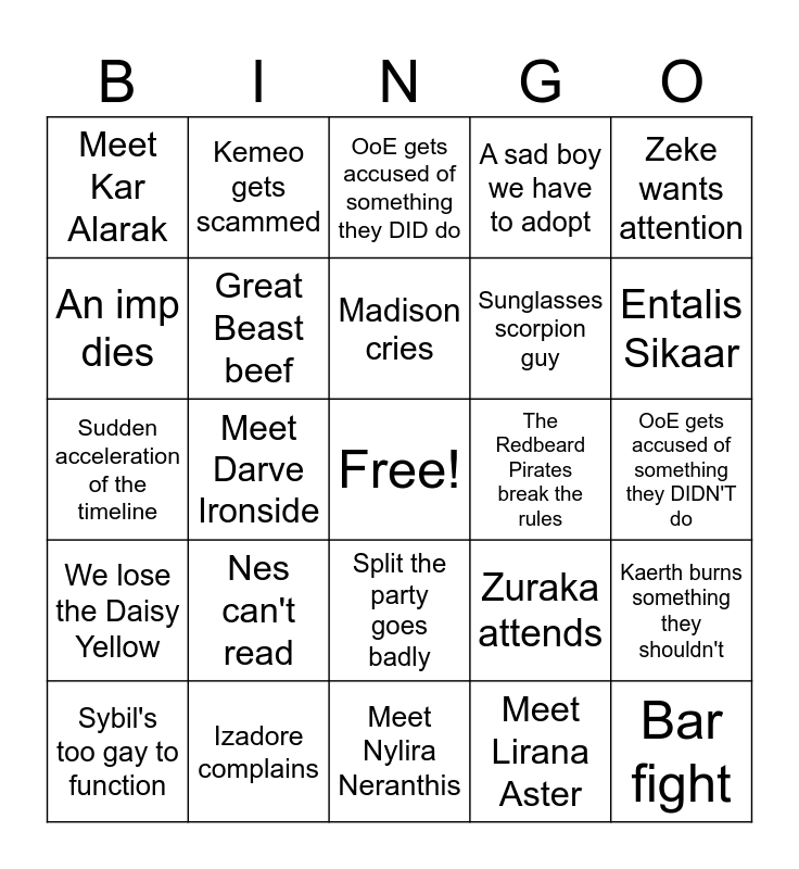 This bingo card has a free space and 24 words: Nes can't read, Izadore complains, Madison cries, Sybil's too gay to function, Zeke wants attention, Meet Kar Alarak, An imp dies, Kemeo gets scammed, The Redbeard Pirates break the rules, Split the party goes badly, Sunglasses scorpion guy, Sudden acceleration of the timeline, Zuraka attends, Kaerth burns something they shouldn't, Great Beast beef, Meet Lirana Aster, OoE gets accused of something they DIDN'T do, OoE gets accused of something they DID do, Entalis Sikaar, Meet Darve Ironside, Bar fight, We lose the Daisy Yellow, A sad boy we have to adopt and Meet Nylira Neranthis.
