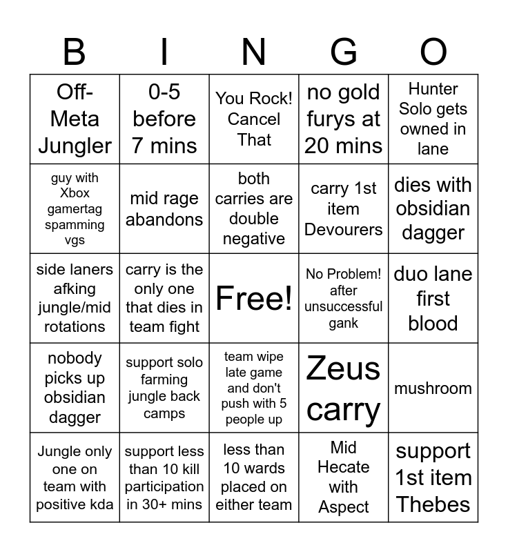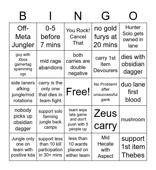 This bingo card has a free space and 24 words: Jungle only one on team with positive kda, support solo farming jungle back camps, both carries are double negative, Mid Hecate with Aspect, Hunter Solo gets owned in lane, Off-Meta Jungler, 0-5 before 7 mins, You Rock! Cancel That, No Problem! after unsuccessful gank, duo lane first blood, side laners afking jungle/mid rotations, mid rage abandons, Zeus carry, mushroom, guy with Xbox gamertag spamming vgs, support less than 10 kill participation in 30+ mins, less than 10 wards placed on either team, no gold furys at 20 mins, dies with obsidian dagger, nobody picks up obsidian dagger, carry is the only one that dies in team fight, team wipe late game and don't push with 5 people up, carry 1st item Devourers and support 1st item Thebes.