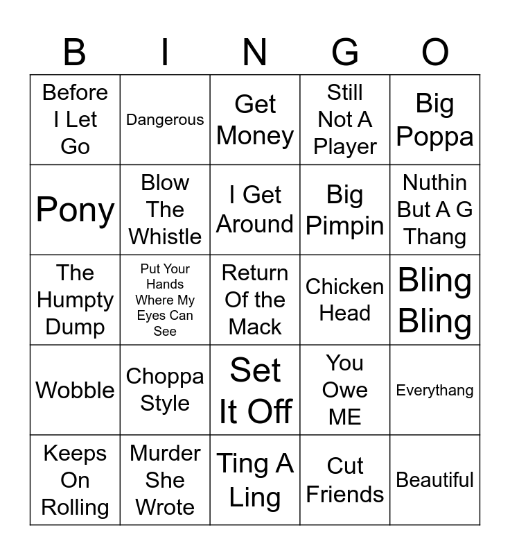 This bingo card has 76 words: Free!, Doin It, Get Money, One More Chance, Money Aint A thang, I Just Wanna Love you, Shake It Fast, Still fly, Party up, Back That Thing Up, Beautiful, What’s It Gonna Be, I Get Around, Pony, Regulate, Put Your Hands Where My Eyes Can See, I Know What You wAnt, Return Of the Mack, Poison, Big Poppa, It was a good day, The Humpty Dump, Blow The Whistle, Dangerous, Still Not A Player, Wifey, EI, Murder She Wrote, Number 1 Stunna, Move, Ghetto Superstar, Sock It To Me, Pass The Courvoiser, You Owe ME, Nuthin But A G Thang, Big Pimpin, If I ruled The World, Down for my n’s, Bling Bling, Cut Friends, What’s Your Fantasy, Boots On The Ground, Freak It, Tootsie Roll, Da Dip, 400 Degrees, Keeps On Rolling, Before I Let Go, How Its Goin Down, Swing My Way, Scrub The Ground, Set It Off, My Boo, Knock If You Buck, Independent, Pull Over, Nasty Song, Too Long, Flex, Cuff It, Choppa Style, I Need a Hot Girl, In Da Club, Drop It Like Its Hot, Bottom of the Map, Lean With It Rock With It, Chicken Head, Nann, Wipe Me Down, Bad Chick, Everythang, Wobble, Murder She Wrote, No Games, Ting A Ling and Hold Yuh.