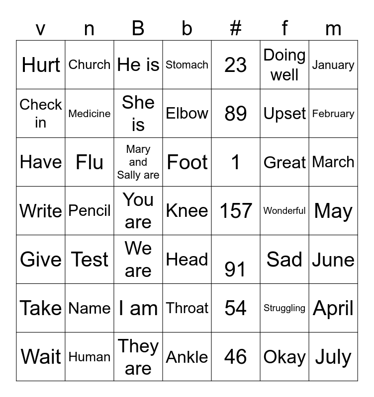 This bingo card has 49 words: Take, Flu, I am, Head, 1, Wonderful, January, Wait, Medicine, You are, Elbow, 23, Upset, March, Give, Test, He is, Foot, 46, Doing well, February, Check in, Church, She is, Ankle, 89, Great, April, Hurt, Pencil, They are, Throat, 91, Struggling, May, Write, Name, We are, Knee, 157, Okay, June, Have, Human, Mary and Sally are, Stomach, 54, Sad and July.