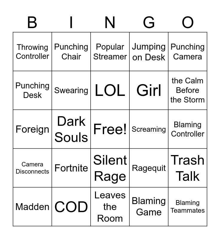 This bingo card has a free space and 24 words: Fortnite, COD, LOL, Madden, Punching Camera, Throwing Controller, Punching Desk, Punching Chair, Screaming, Silent Rage, Girl, Foreign, Ragequit, Trash Talk, Swearing, Blaming Game, Blaming Controller, Popular Streamer, the Calm Before the Storm, Dark Souls, Blaming Teammates, Camera Disconnects, Jumping on Desk and Leaves the Room.
