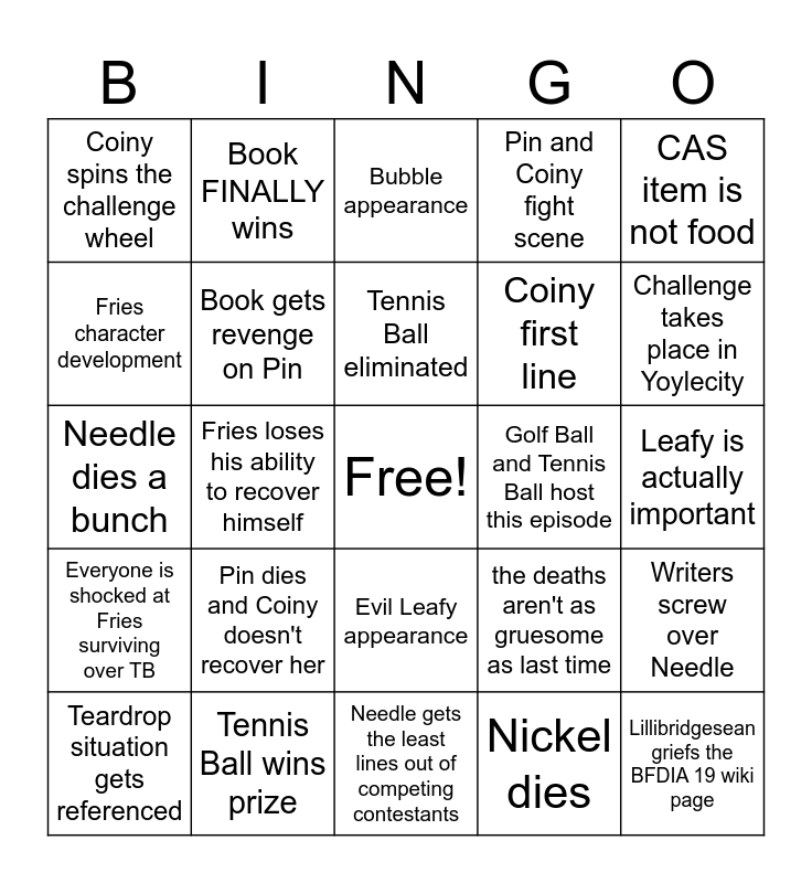 This bingo card has a free space and 24 words: Pin dies and Coiny doesn't recover her, Tennis Ball wins prize, Tennis Ball eliminated, Teardrop situation gets referenced, CAS item is not food, Coiny spins the challenge wheel, Fries character development, Book FINALLY wins, Golf Ball and Tennis Ball host this episode, Evil Leafy appearance, Coiny first line, Needle dies a bunch, the deaths aren't as gruesome as last time, Writers screw over Needle, Book gets revenge on Pin, Nickel dies, Leafy is actually important, Bubble appearance, Challenge takes place in Yoylecity, Fries loses his ability to recover himself, Lillibridgesean griefs the BFDIA 19 wiki page, Everyone is shocked at Fries surviving over TB, Pin and Coiny fight scene and Needle gets the least lines out of competing contestants.