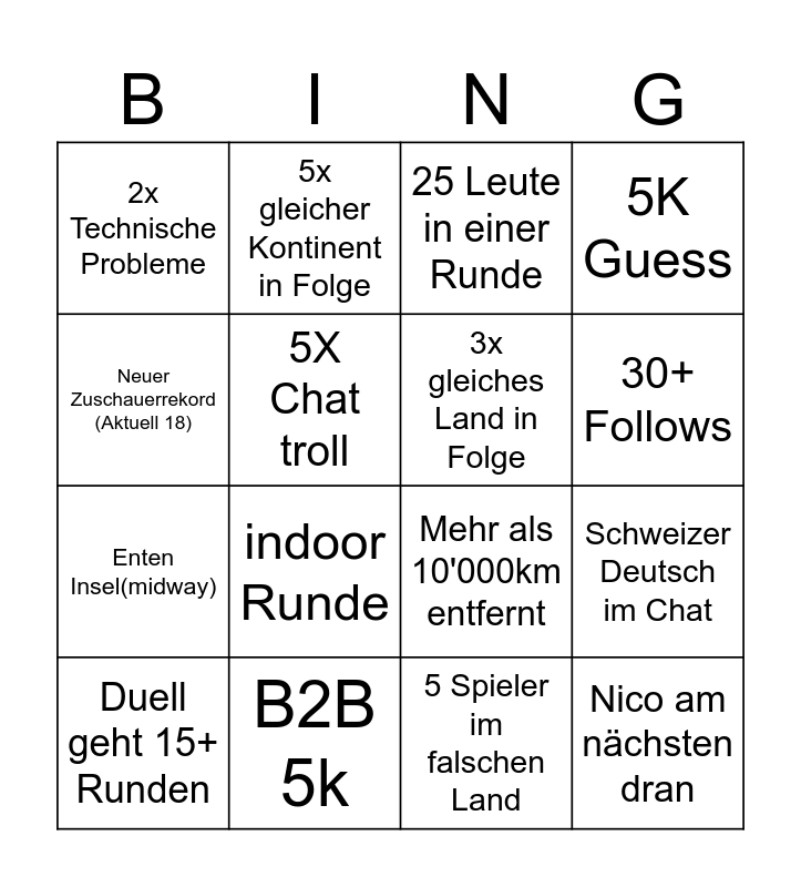 This bingo card has 16 words: B2B 5k, Schweizer Deutsch im Chat, 25 Leute in einer Runde, 2x Technische Probleme, Enten Insel(midway), 5x gleicher Kontinent in Folge, Mehr als 10'000km entfernt, 5 Spieler im falschen Land, Neuer Zuschauerrekord (Aktuell 18), 5X Chat troll, Duell geht 15+ Runden, 5K Guess, indoor Runde, 30+ Follows, 3x gleiches Land in Folge and Nico am nächsten dran.