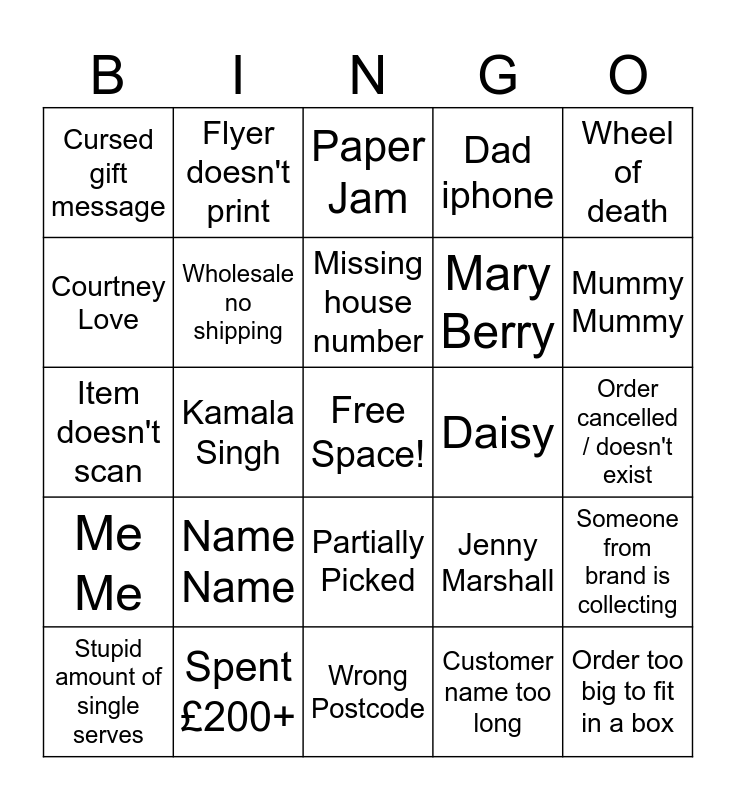 This bingo card has a free space and 24 words: Name Name, Spent £200+, Missing house number, Stupid amount of single serves, Wheel of death, Cursed gift message, Courtney Love, Flyer doesn't print, Daisy, Partially Picked, Mary Berry, Item doesn't scan, Jenny Marshall, Someone from brand is collecting, Wholesale no shipping, Customer name too long, Order cancelled / doesn't exist, Paper Jam, Mummy Mummy, Kamala Singh, Order too big to fit in a box, Me Me, Dad iphone and Wrong Postcode.