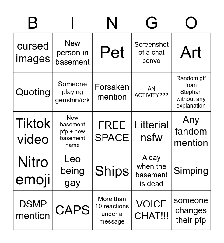 This bingo card has a free space and 24 words: Leo being gay, CAPS, Forsaken mention, DSMP mention, Art, cursed images, Quoting, New person in basement, Litterial nsfw, Ships, AN ACTIVITY???, Tiktok video, A day when the basement is dead, Simping, Someone playing genshin/crk, VOICE CHAT!!!, Any fandom mention, Pet, Random gif from Stephan without any explanation, New basement pfp + new basement name, someone changes their pfp, Nitro emoji, Screenshot of a chat convo and More than 10 reactions under a message.