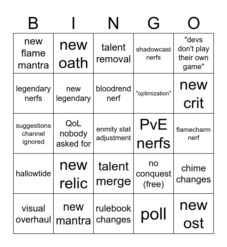 This bingo card has 25 words: new relic, rulebook changes, bloodrend nerf, visual overhaul, "devs don't play their own game", new flame mantra, legendary nerfs, new oath, PvE nerfs, talent merge, "optimization", suggestions channel ignored, no conquest (free), chime changes, new legendary, new ost, flamecharm nerf, talent removal, new crit, QoL nobody asked for, enmity stat adjustment, new mantra, hallowtide, shadowcast nerfs and poll.