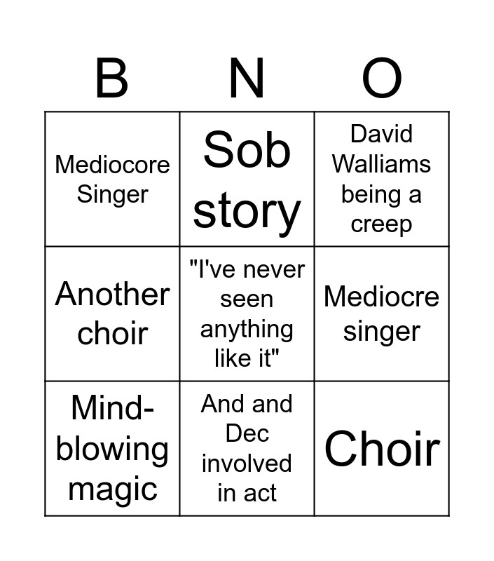 This bingo card has 20 words: "I didn't like it I loved it", Terrible act getting through, David Walliams being a creep, Golden buzzer for an act that was going through anyway, Sob Story, "I've never seen anything like it", "I was not expecting that", Mediocore Singer, Choir, Sob story, "I didn't like it, I loved it", "That's about 4 thousands yeses", Mediocre singer, "Sen-Say-Tional", Mind-blowing magic, Judges involvement in act, And and Dec involved in act, Another choir, "I've never seen anything like it" and Simon interrupts an act to start again.