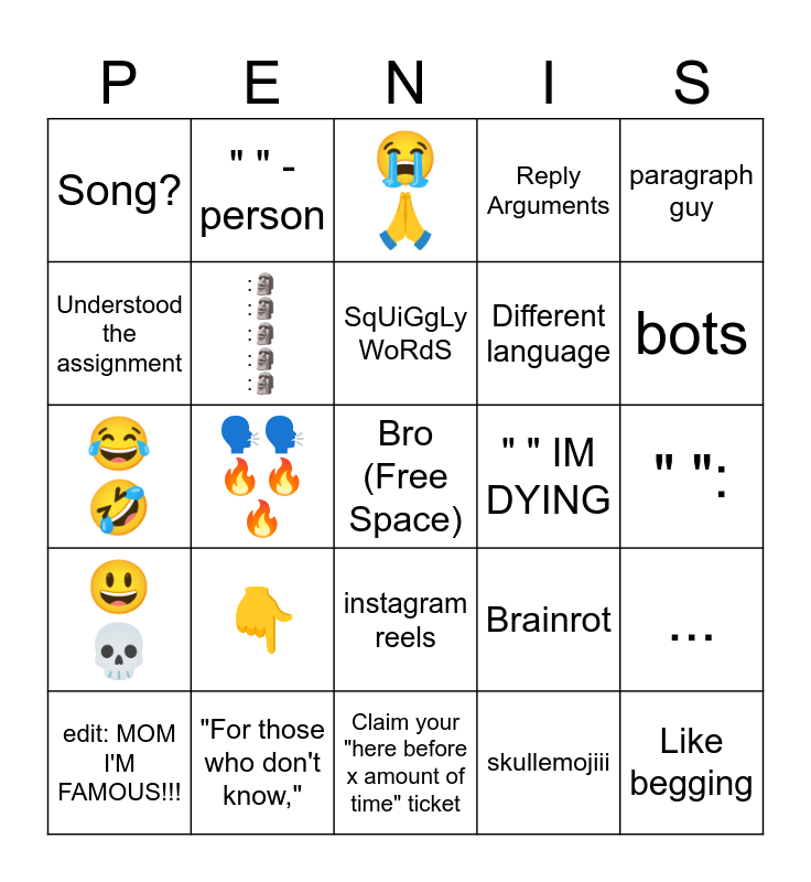 This bingo card has a free space and 44 words: first, Like begging, Pin begging, edit: MOM I'M FAMOUS!!!, POV:, skullemojiii, 😭🙏, WE ____ WITH THIS ONE, paragraph guy, "For those who don't know,", Reply Arguments, " " IM DYING, instagram reels, 👇, Team ___ 👇, Claim your "here before x amount of time" ticket, Here before, 😂🤣, 4 year olds, bots, " " -person, As a..., Repeating comments, Song?, Actually pretty good, " ":, ❌ ✅, Caught me off guard, Brainrot, 😃💀, ahh, ..., Bad grammer, ❤️ spam, 🗣️🗣️🔥🔥🔥, "Respect to ___", Instructions unclear, 📈📉, SqUiGgLy WoRdS, Understood the assignment, Different language, ☑️, :🗿 :🗿 :🗿 :🗿 :🗿 and ___ is wild.