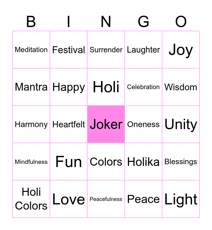 This bingo card has a free space and 26 words: Colors, Peace, Holi, Love, Joy, Meditation, Mantra, Festival, Unity, Holika, Celebration, Harmony, Blessings, Holi Colors, Heartfelt, Bliss, Laughter, Mindfulness, Surrender, Light, Wisdom, Peacefulness, Oneness, Fun, Happy and Heart.